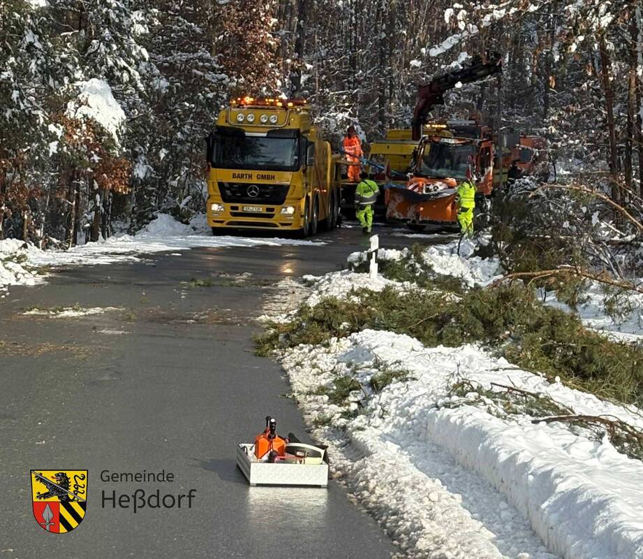 Axel Gotthardt/Gemeinde HeßdorfBei Hesselberg ist gestern Nacht ein Räumfahrzeug verunglückt, als es einem wegen der Schneelast umgestürzten Baum ausweichen musste und dabei in den Graben rutschte. Wegen der Bergungsarbeiten und auch der Gefahr, dass weitere Bäume umstürzen könnten, musste die Straße gesperrt werden. Aufgrund der hohen Gefahr an dieser Stelle konnte die Bergung des Fahrzeugs erst heute Vormittag abgeschlossen werden.