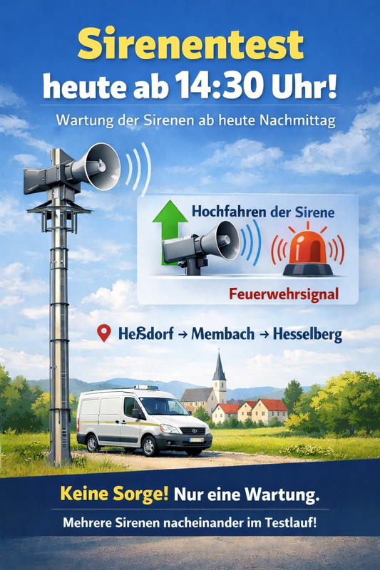 Heute ab 14:30 Uhr führt eine beauftragte Firma in Heßdorf eine Wartung der Sirenen durch. Im Zuge dessen werden alle Sirenen unserer Feuerwehren im Gemeindegebiet nacheinander getestet – der gesamte Vorgang dauert etwa eine Stunde.