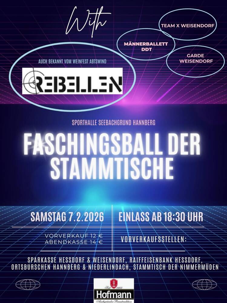 Am 07.02.2025 findet der 27. Faschingsball der Stammtische in der Sporthalle Seebachgrund statt. Auch diesmal werden wieder die „Rebellen“ aufspielen.