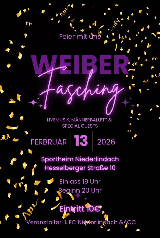 Am Freitag den 13. Februar 2026 findet wieder der traditionelle Weiberfasching diesmal im Sportheim Niederlindach statt.